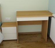 Ещё мы спроектировали и сделали две тумбочки и маленький столик для ноутбука. Это всё встало плотно, как и рассчитывал клиент, каждый сантиметр с пользой.