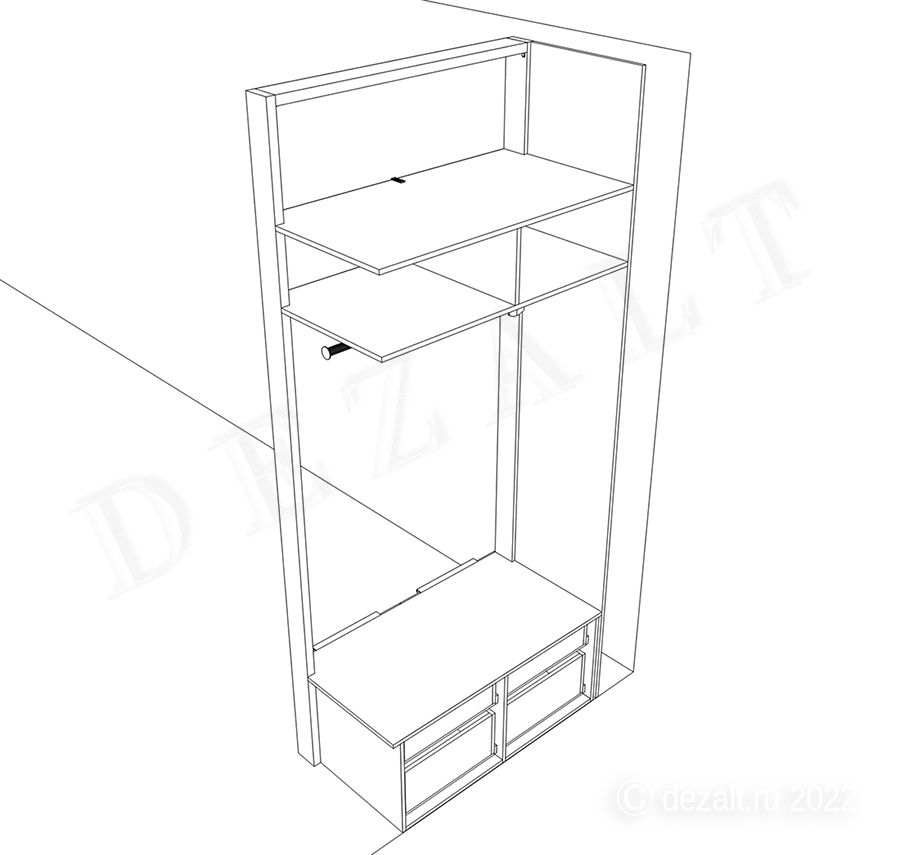 В прихожей новой квартиры есть ниша глубиной 58см. Хозяин думал сделать шкаф-купе, но смущало что пространства для одежды останется 48см., этого маловато для одежды на плечиках, ведь нужно минимум 50см., а лучше 55см. Мы обсудили возможные конструкции и остановились на самой простой — распашные двери.