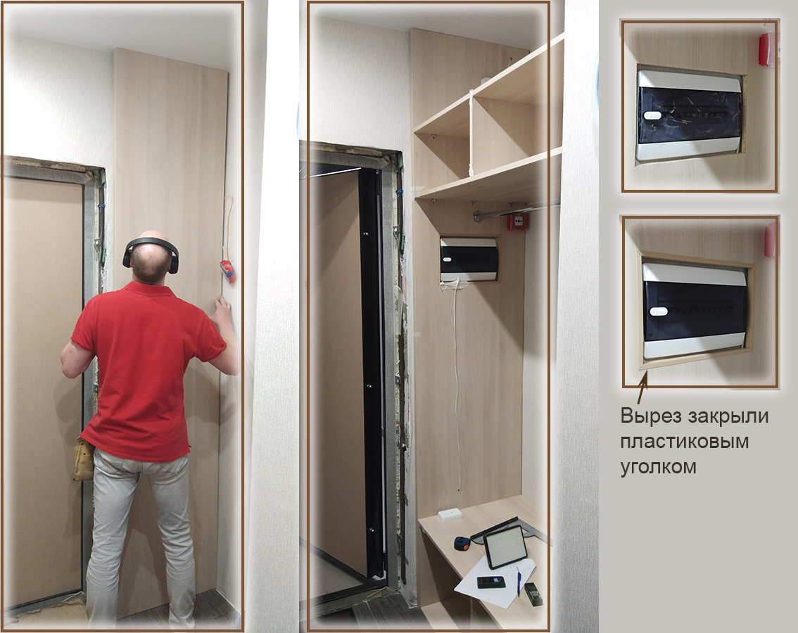 Договорились, что сделаем в левой боковине вырез под электрический щиток, перенесем кнопку противопожарной безопасности на боковину, проведем розетку в шкаф и подключим роутер.