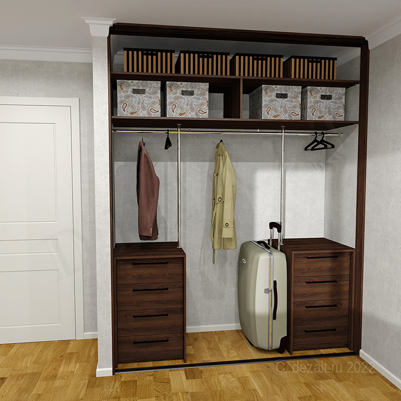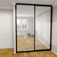 Сначала Андрей хотел шкаф в темных тонах с зеркалами, чтобы профиль и корпус были под темное дерево. Я таким его и изобразил в проекте.