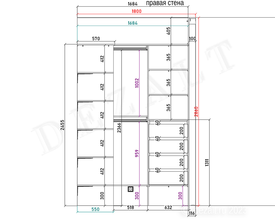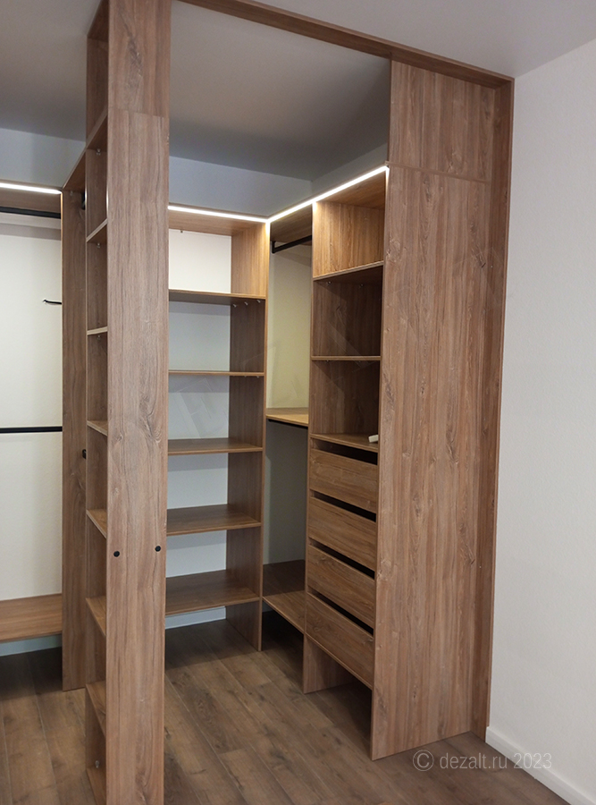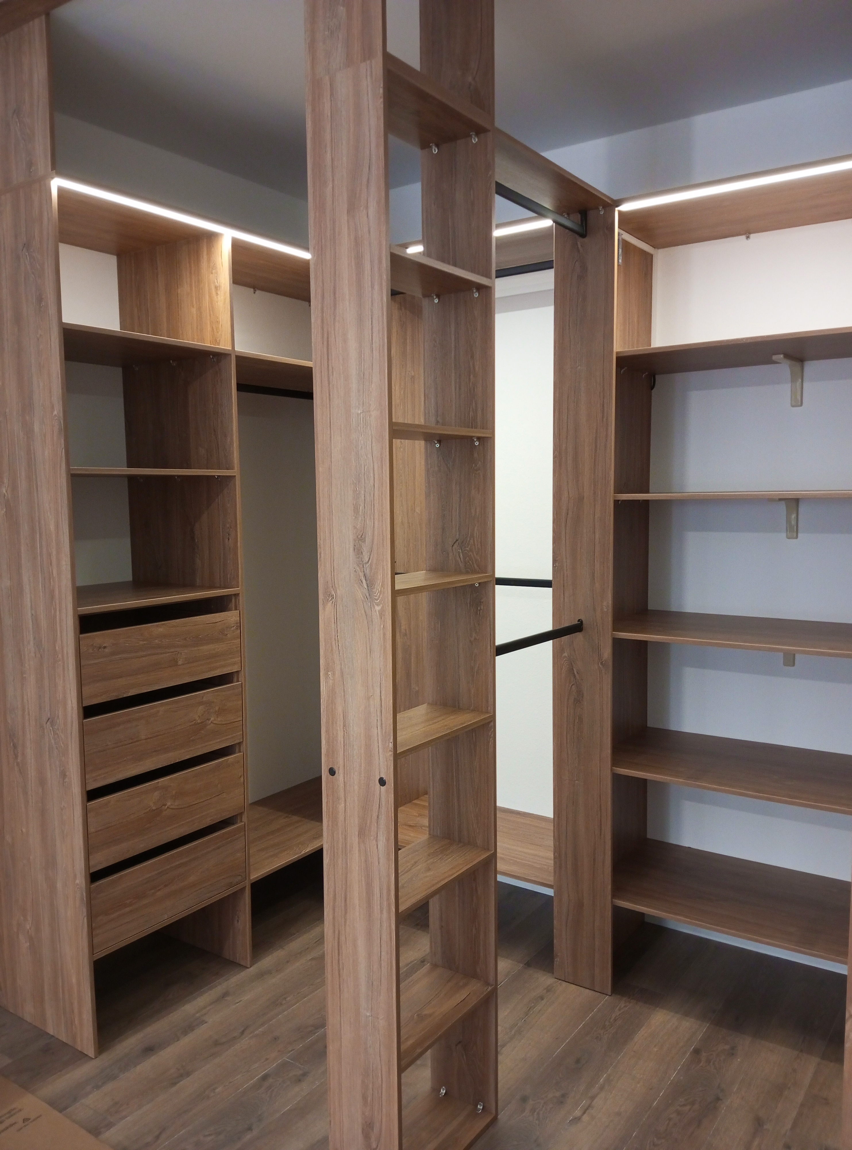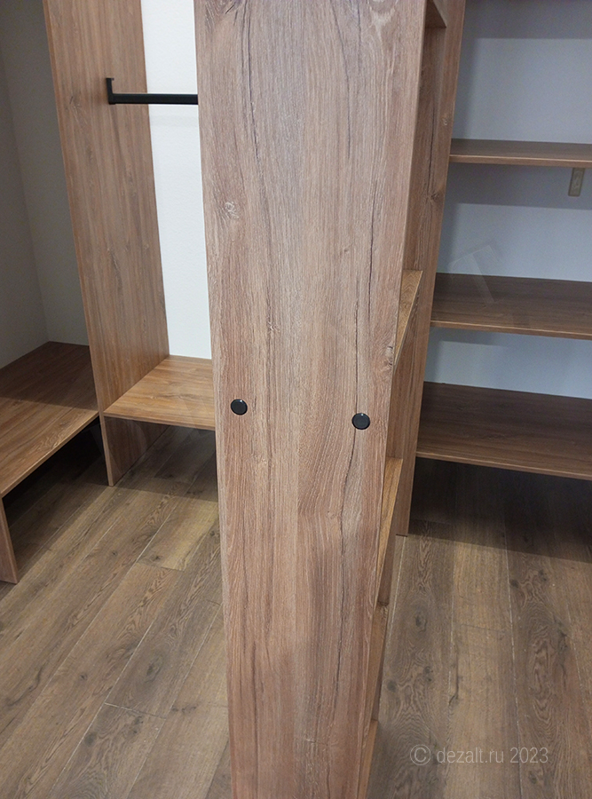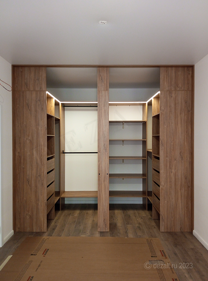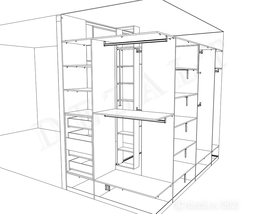 Когда я проектировал гардеробную, настойчиво предлагал Павлу разместить все штанги вдоль фронтальной стены, чтобы полки и ящики были только по бокам, но заказчик так не захотел. Сделали как он хотел.