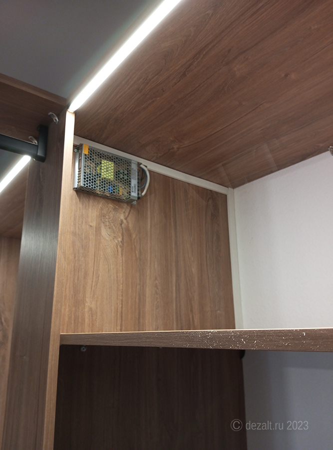 По просьбе клиента я сразу предусмотрел подсветку в гардеробной, мне казалось что продумал всё досконально, как провести провода, где сделать фрезеровку, как разместить дублирующие сенсорные кнопки с двух сторон для удобства. Продумал всё, кроме одного - я купил черный рассеиватель. Этот рассеиватель «своровал» половину яркости ленты. Да, смотрится стильно в выключенном состоянии на фоне черных штанг, но от него получился только вред. Черный рассеиватель снимает функциональные свойства с освещения превращая его в декоративные.