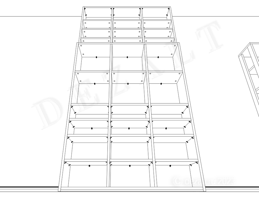 ЛДСП которое захотел использовать клиент, было толщиной 25мм и конечно же это «Эггер», декор называется — «Серый уголь». Крепеж мы использовали 4-х видов: шканты, эксцентриковая стяжка, саморезы, итальянские полкодержатели. Большой стеллаж является встроенным! Мы утачивали его высоту дома у клиента, делали его враспор от пола в потолок. Крепили стеллаж к стене при помощи специальных дюбелей, так-как стена со звукоизоляцией.