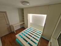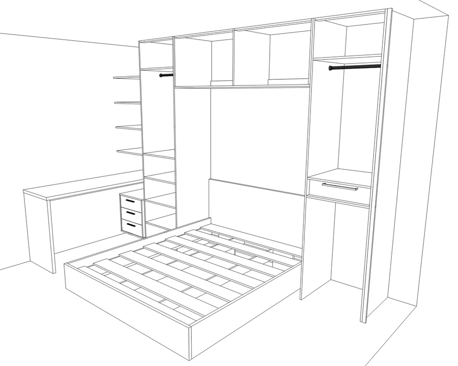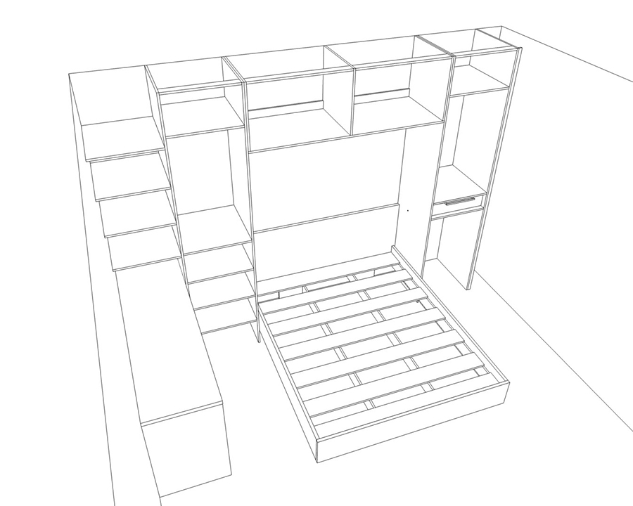 Кровать мы сделали пожалуй в третий раз с 2009 года. Во-первых, это не наша специализация, делать кровать. Во-вторых, кровать полностью из ЛДСП не совсем правильно. Обычно кровать состоит из металлического каркаса с деревянными ламелями, а окантовка кровати уже может быть из ЛДСП или любого другого материала, вплоть до металла. Современные кровати почти всегда имеют подъемный механизм, который поднимает матрац вверх и внизу можно что-то хранить. Тут всё не так.