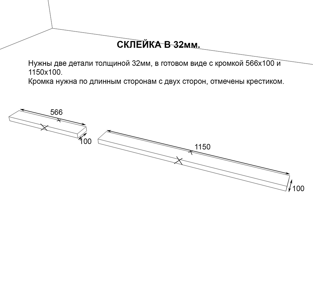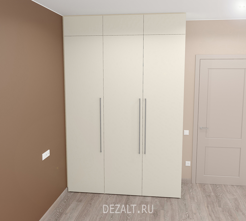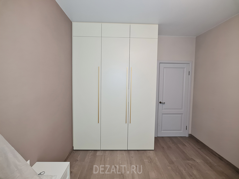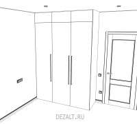 С левой стороны нам пришлось сделать отступ от стены и закрыть щель планкой-добором. Если б мы этого не сделали, левая дверь не смогла бы полностью открываться, мешался бы плинтус внизу, либо, нам пришлось бы делать высокий цоколь у шкаф и уменьшать двери по высоте. Заказчики решили что этот вариант, как мы сделали, будет лучше.