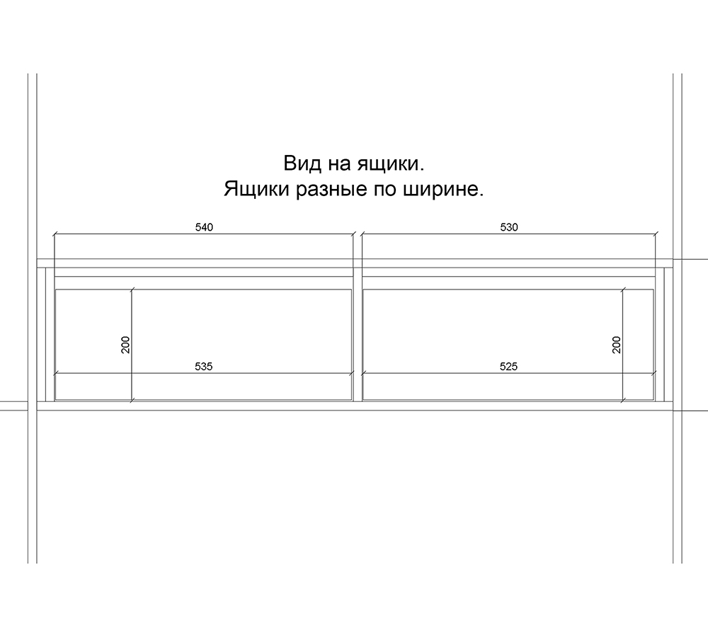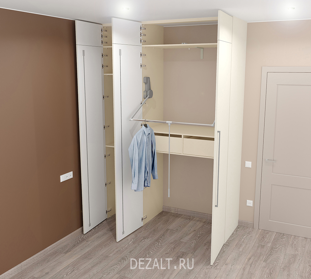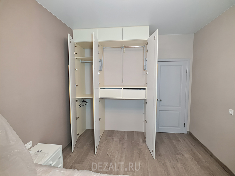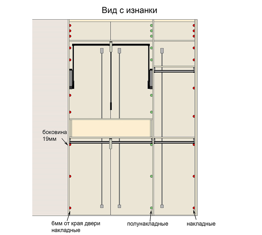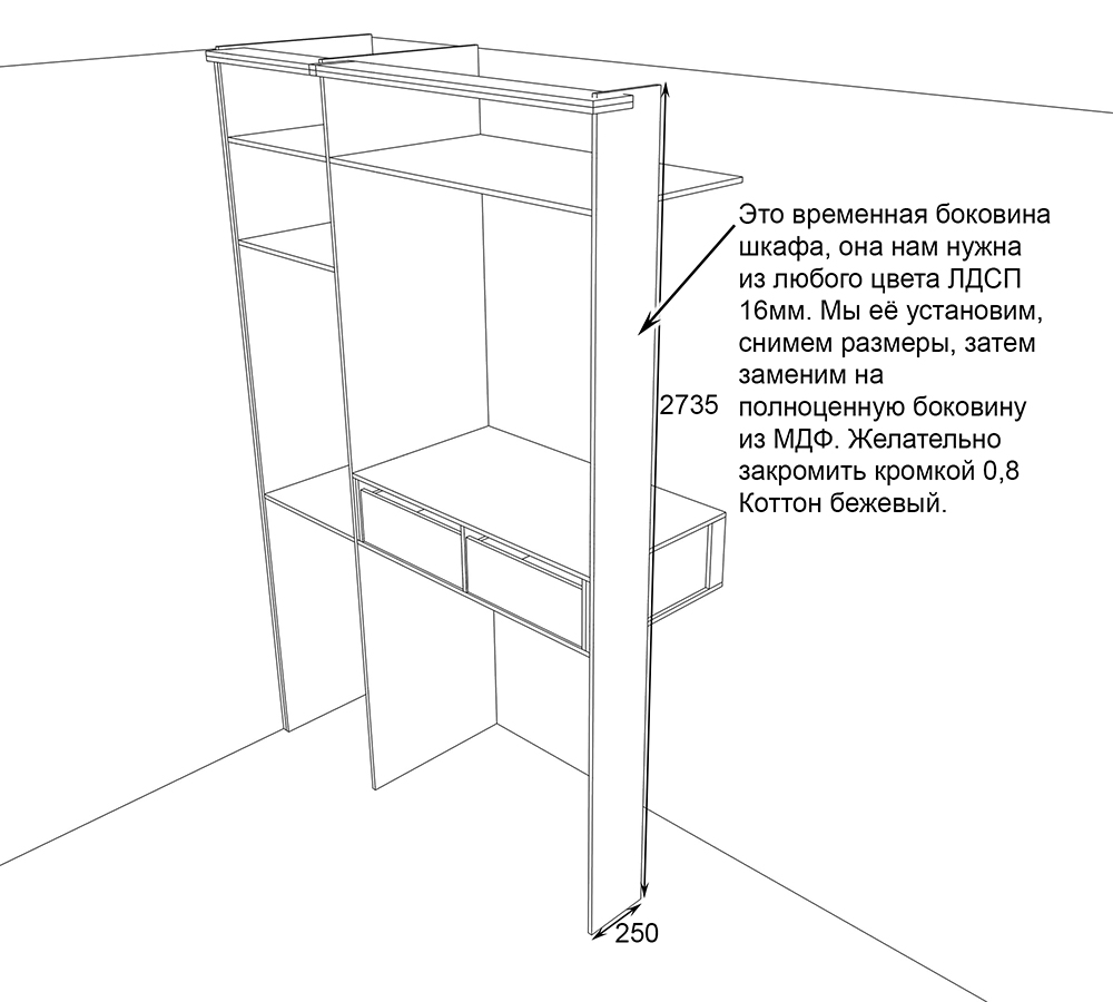 По конструкции шкаф был достаточно простой. Ольга попросила сделать 3 штанги для коротких вещей, поставить один пантограф и сделать два выдвижных ящика для нижнего белья на уровне груди.