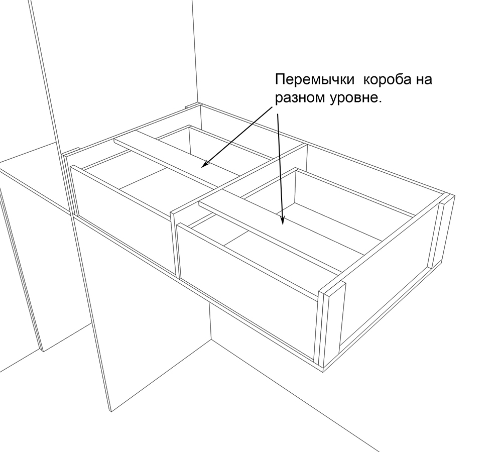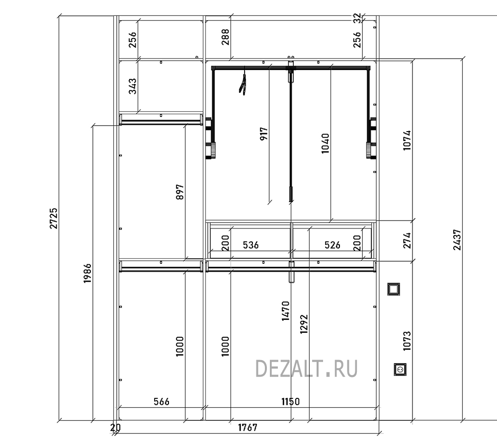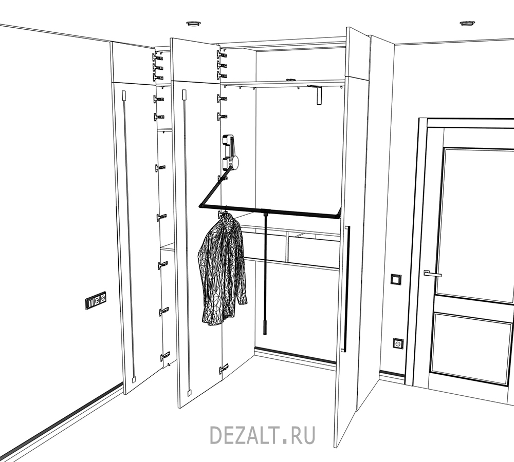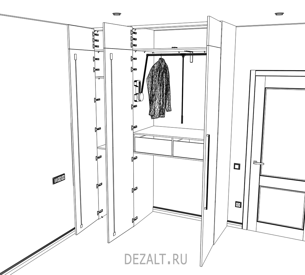 По конструкции шкаф был достаточно простой. Ольга попросила сделать 3 штанги для коротких вещей, поставить один пантограф и сделать два выдвижных ящика для нижнего белья на уровне груди.