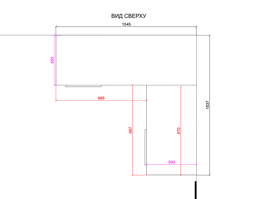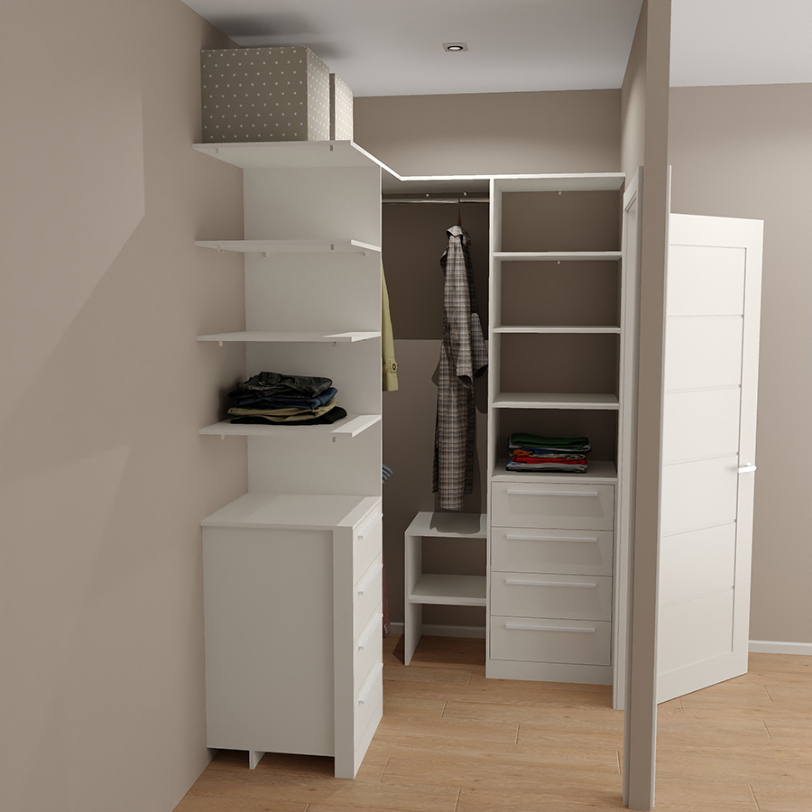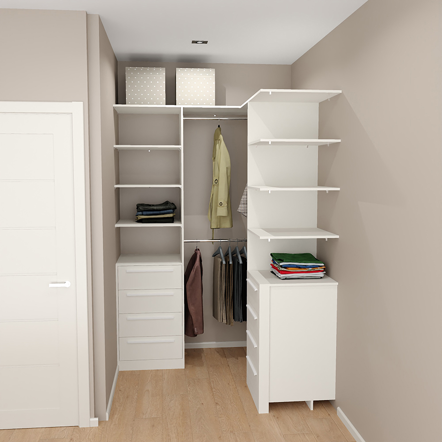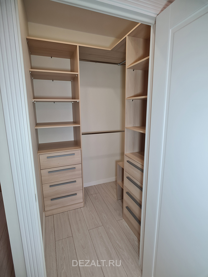 Размеры помещения для хранения одежды — 1,5 на 1,5 метра. Входная дверь расположена слева, поэтому оптимальным решением стала Г-образная конструкция.