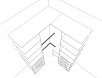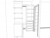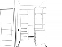 Мы предложили разместить справа колонку с полками и выдвижными ящиками, а остальное пространство занять антресолями и штангами. Однако заказчик пожелал увеличить количество ящиков и полочек. В связи с этим мы добавили ещё одну колонку напротив входной двери. В углу разместили несколько штанг.