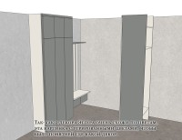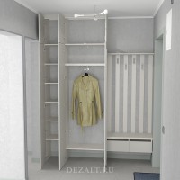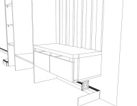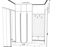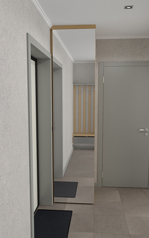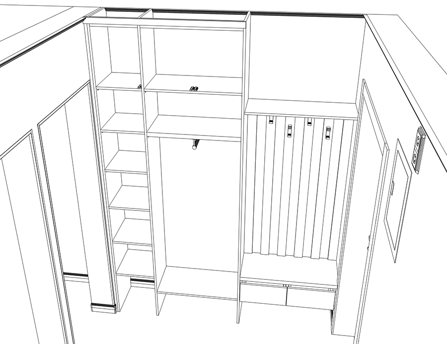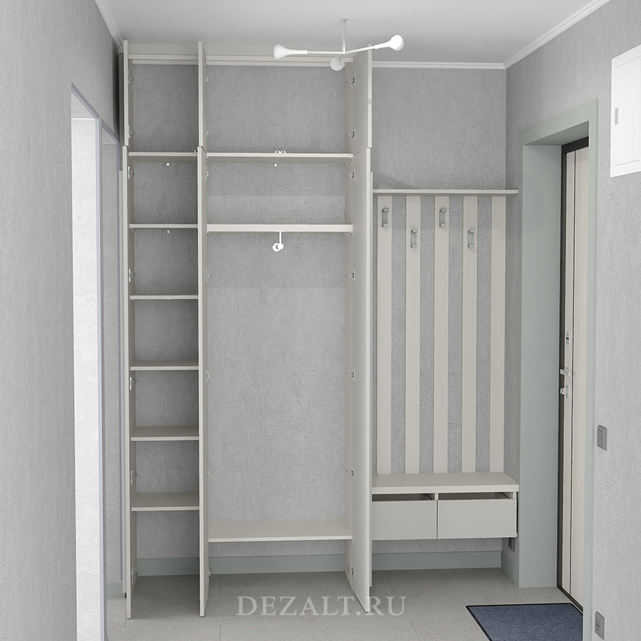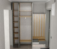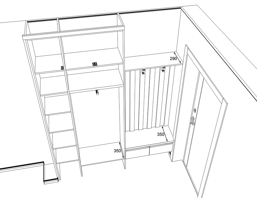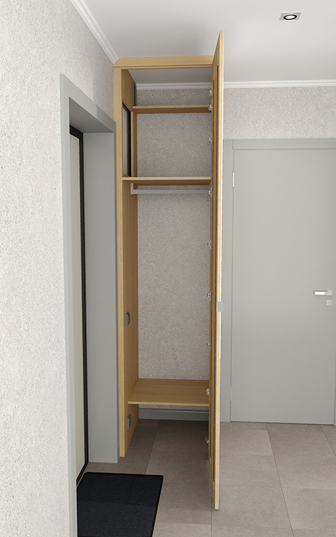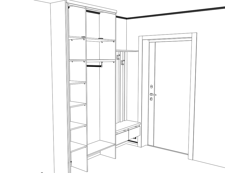 С открытой секцией для одежды пришлось проявить изобретательность. Не хватало места для выдвижных ящиков и сиденья на тумбе для переобувания. Я предложил необычное решение — вынести сиденье наружу, на наличник входной двери. Хотя это противоречит правилам интерьерного дизайна, в условиях ограниченного пространства приходится искать нестандартные решения. Я подготовил чертежи и 3D-визуализации, и семья согласилась с предложением.