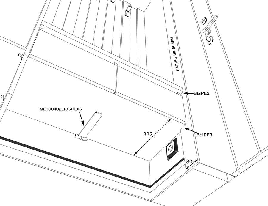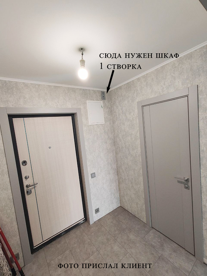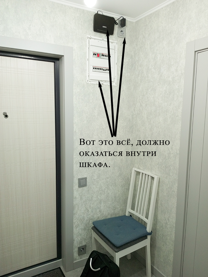 Внутри одностворчатого шкафа мы организовали вырез для электрического щитка и разместили роутер для интернета. Я предлагал перенести розетку со стены на боковину шкафа, чтобы она не находилась в глубине, но заказчик Артём настоял на вырезе без переноса.