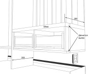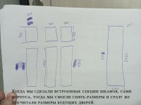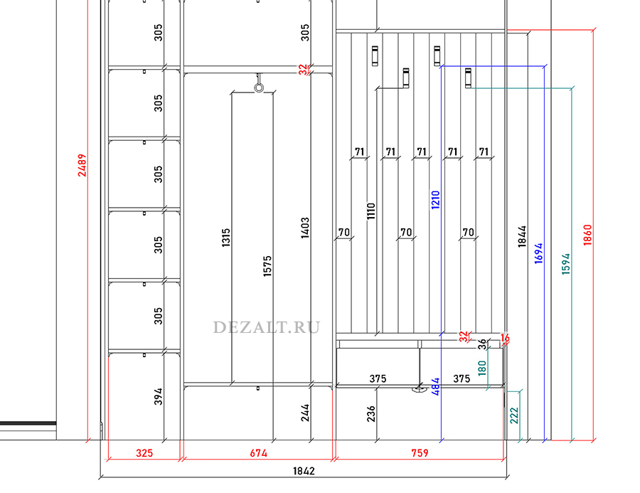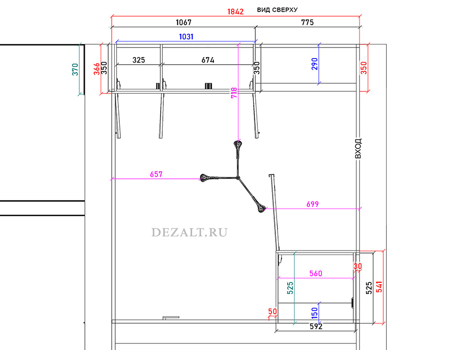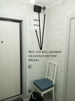 Основной трёхдверный шкаф имеет нестандартную глубину — всего 350 мм, что недостаточно для продольной штанги. Пришлось развернуть штангу поперёк шкафа, хотя это менее удобно в использовании.