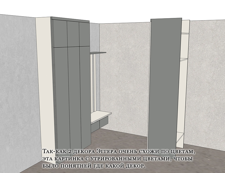 Интересный момент возник с выбором цвета. Заказчики выбрали два очень похожих оттенка ЛДСП от компании «Эггер» — «Бело-серый» и «Светло-серый». На мой вопрос о целесообразности такого решения они ответили, что различают эти оттенки и им так нравится. Несмотря на отсутствие контраста между цветами, мы выполнили их пожелание. Для удобства во время производства я создал специальные схемы с более насыщенными цветами, чтобы не перепутать декоры.