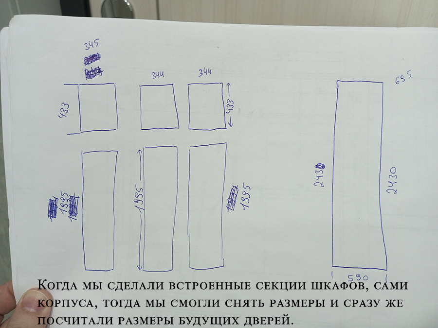 На распашные двери шкафа мы установили только две ручки вместо трёх для более стильного внешнего вида. Средняя дверь открывается изнутри рукой.