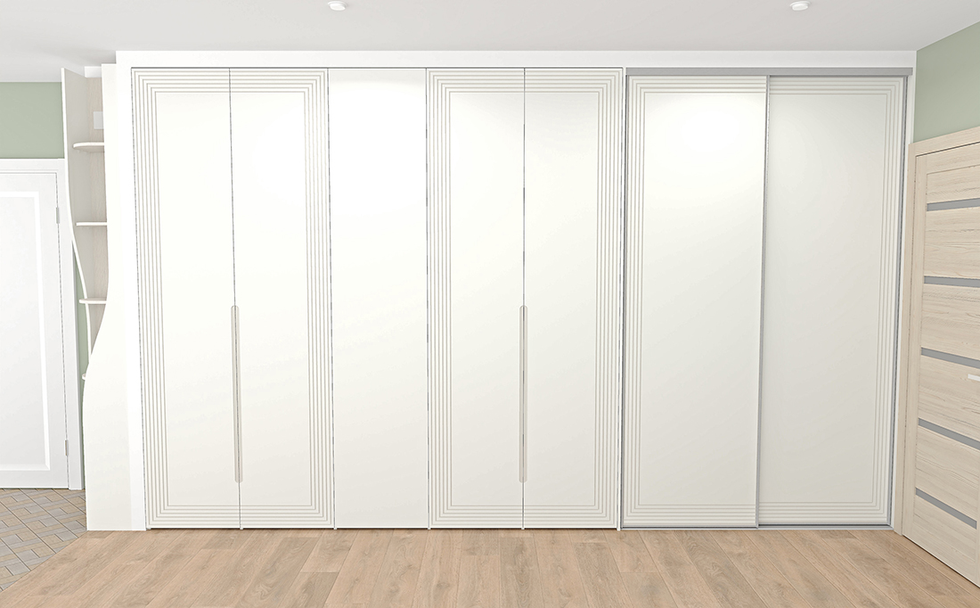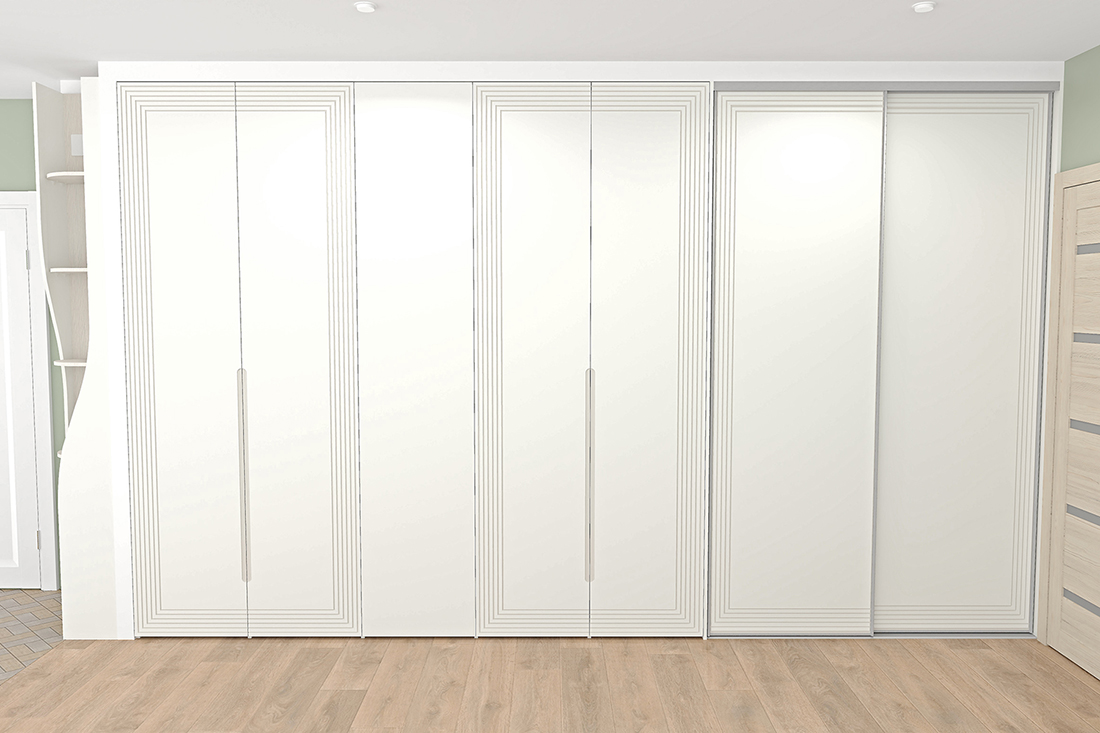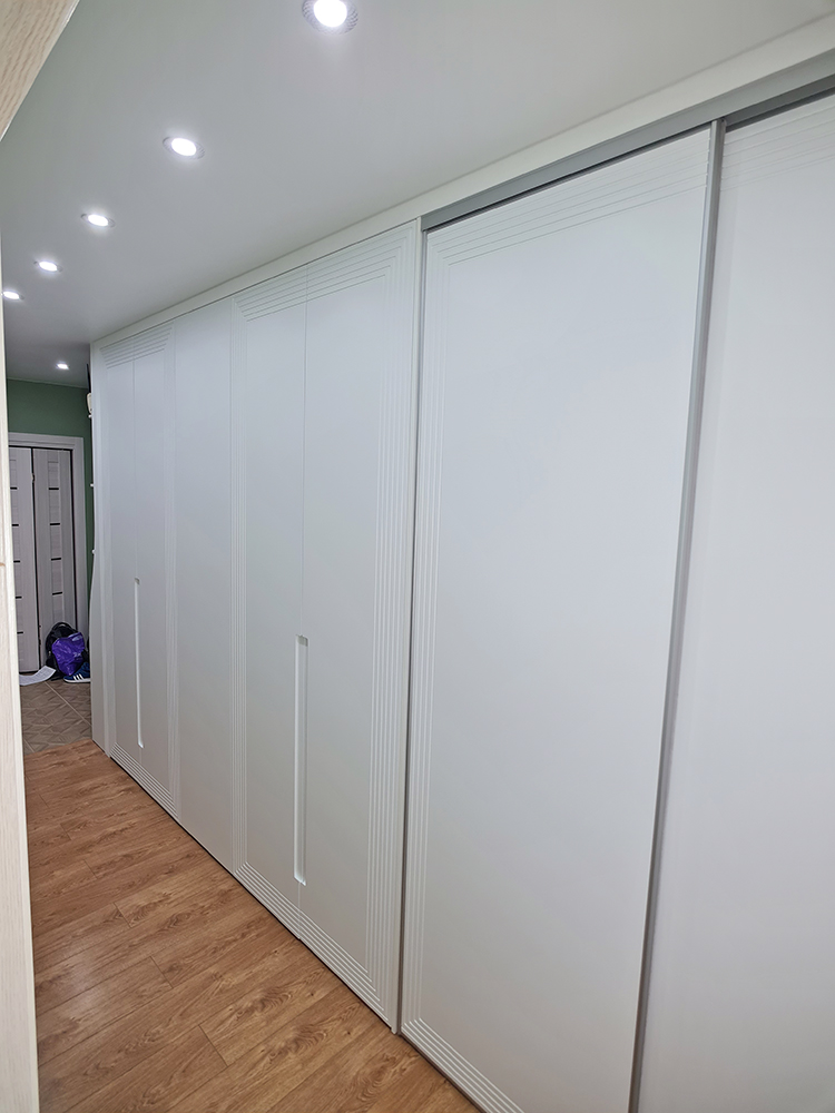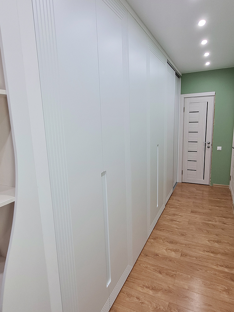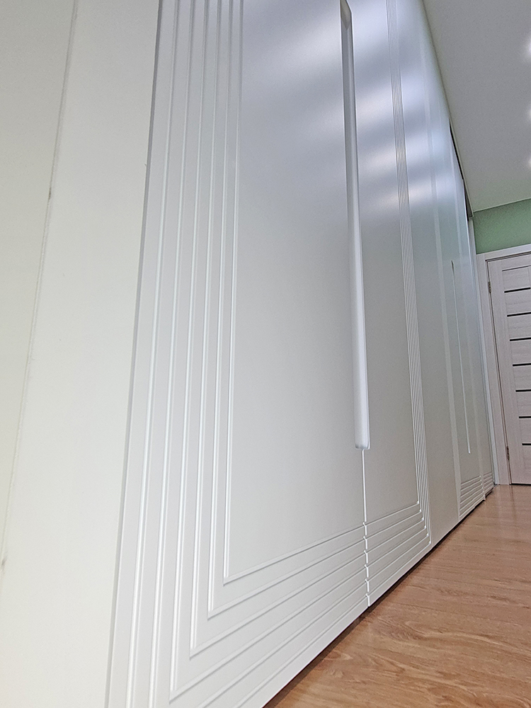 Помимо декоративной фрезеровки, выполнили техническую — с внутренней стороны каждой двери. В неё вставили корректоры против изгиба. МДФ при длине более двух метров склонен изгибаться, а для дверей это критично: возникает ощущение, что фасад шкафа кривой. Корректоры выравнивают дверь, делая её идеально ровной.