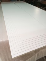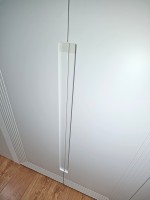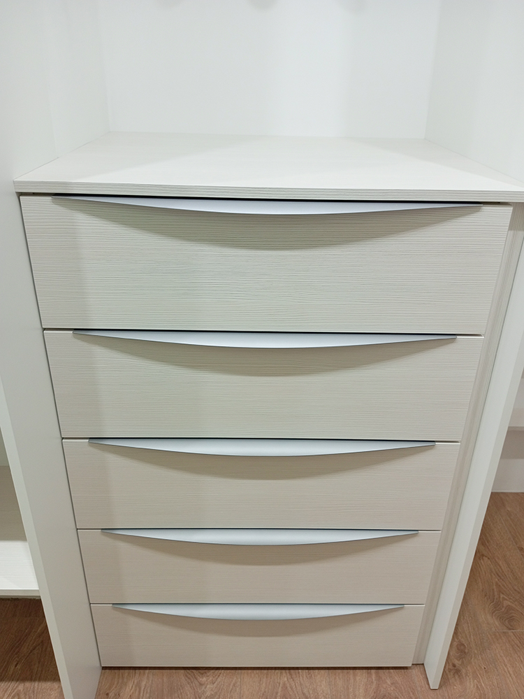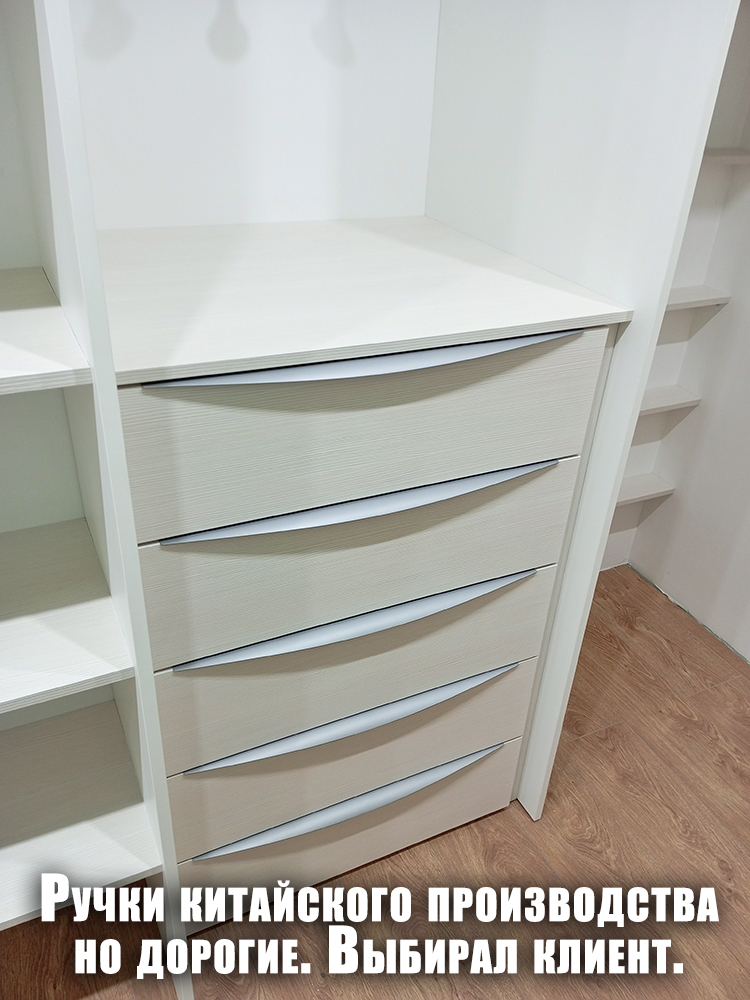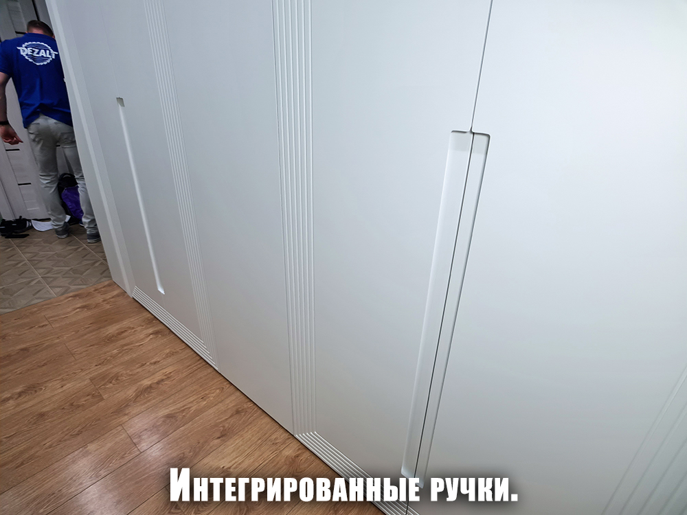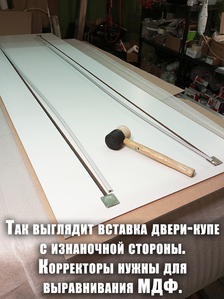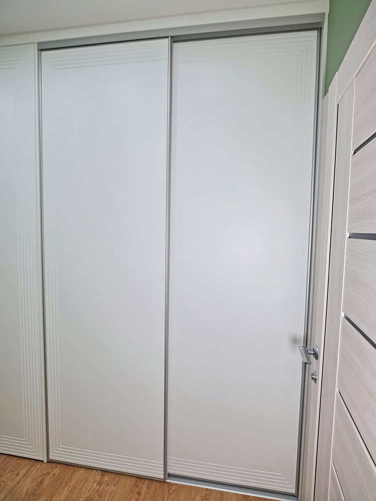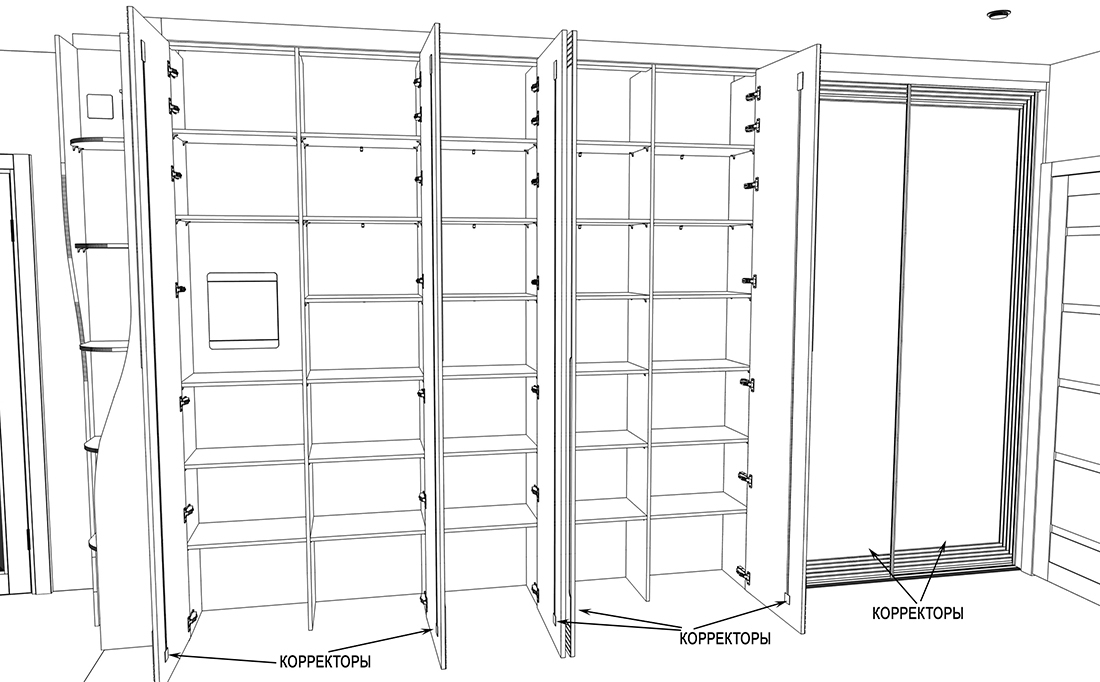 Помимо декоративной фрезеровки, выполнили техническую — с внутренней стороны каждой двери. В неё вставили корректоры против изгиба. МДФ при длине более двух метров склонен изгибаться, а для дверей это критично: возникает ощущение, что фасад шкафа кривой. Корректоры выравнивают дверь, делая её идеально ровной.