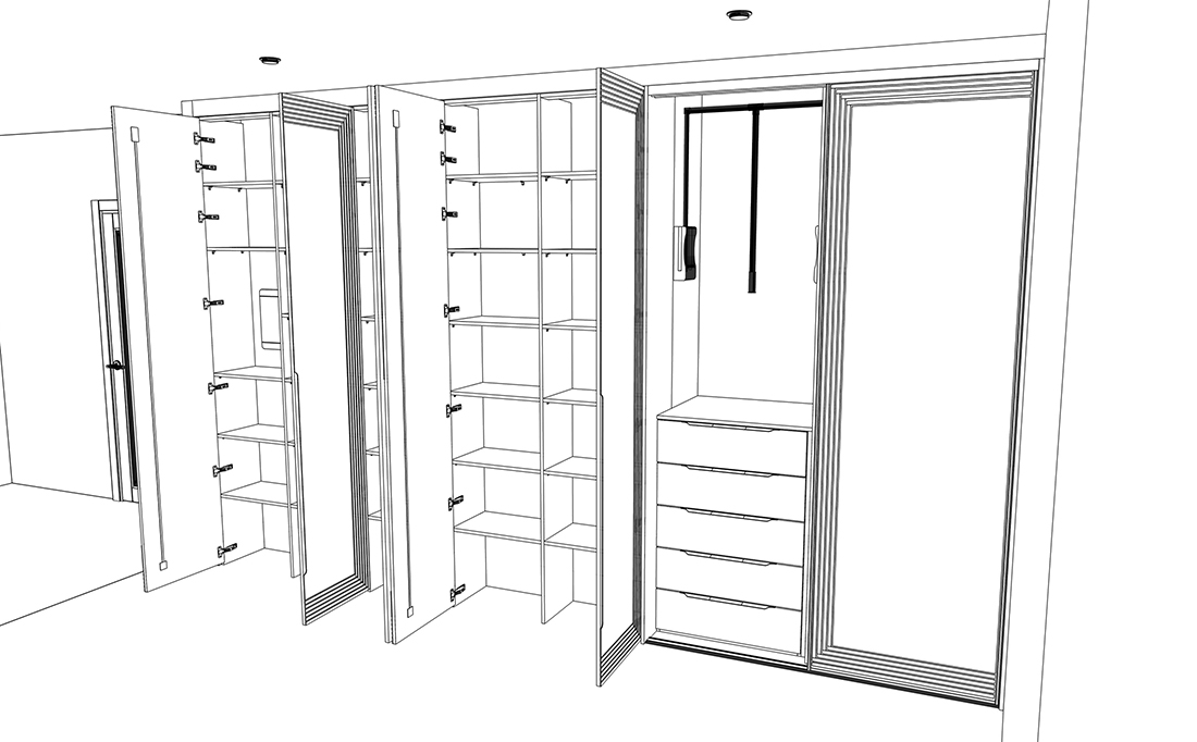 Мы сделали несколько набросков будущего шкафа. Поэкспериментировали с вариантами дверей, ручек и общего оформления — и предложили Ирине разные решения.