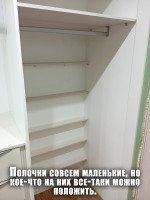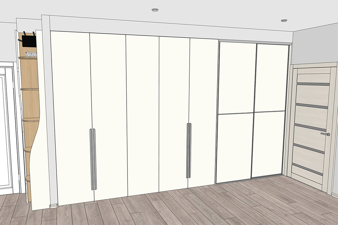 Ирине нужен был шкаф в длинный коридор, и она обратилась к нам за проектом. Семья состоит из четырёх человек, поэтому требовалось уместить много вещей.