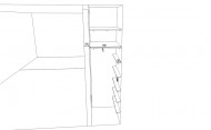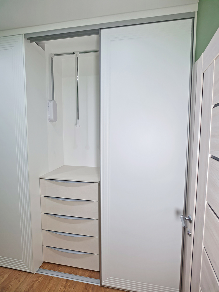 Простенки в коридоре оказались разной глубины, поэтому шкаф получился двухуровневым, с разными типами дверей. Там, где глубина 340 мм, запланировали распашные двери. Там, где 744 мм, — двери‑купе. Учли, что двери‑купе «съедают» 100 мм полезной глубины: внутри останется 640 мм для полок и одежды на плечиках.