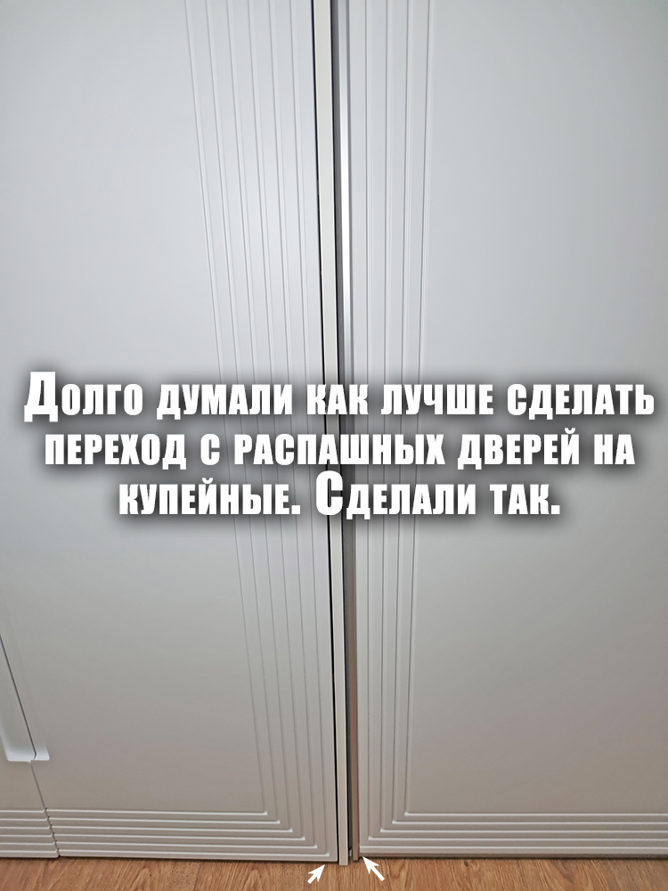 Лицевую сторону дверей окрасили эмалью белого цвета с матовым эффектом — именно так, как хотела Ирина. Изнаночную сторону оставили в белом ламинированном исполнении: её мы не трогали.